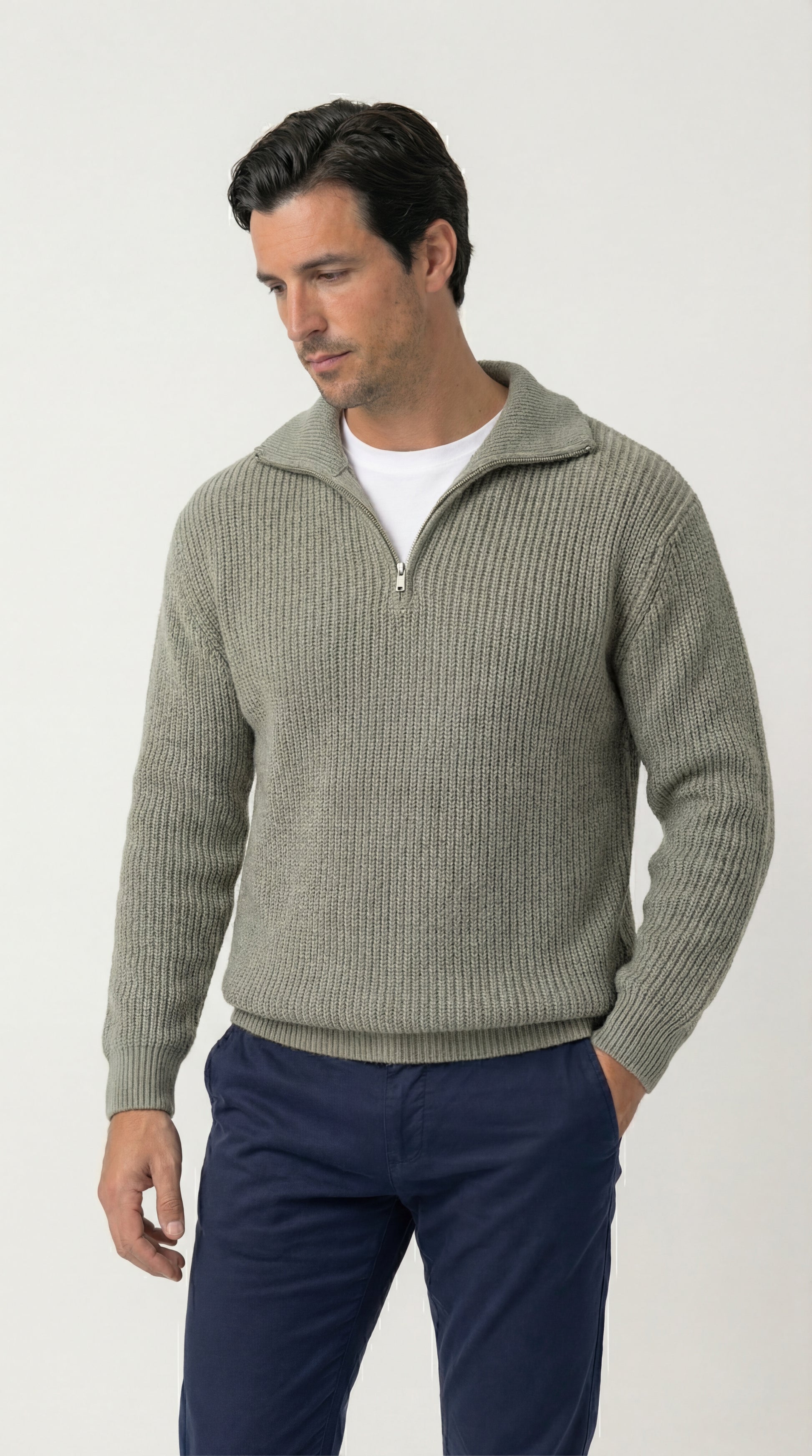 Este jersey para hombre le permite combatir el frío con elegancia. De tacto suave y lujoso, está confeccionado en puro algodón con un acabado texturizado refinado e incorpora todos los detalles clásicos, como un cuello con cierre de cremallera, hombros caídos y mangas largas amplias.